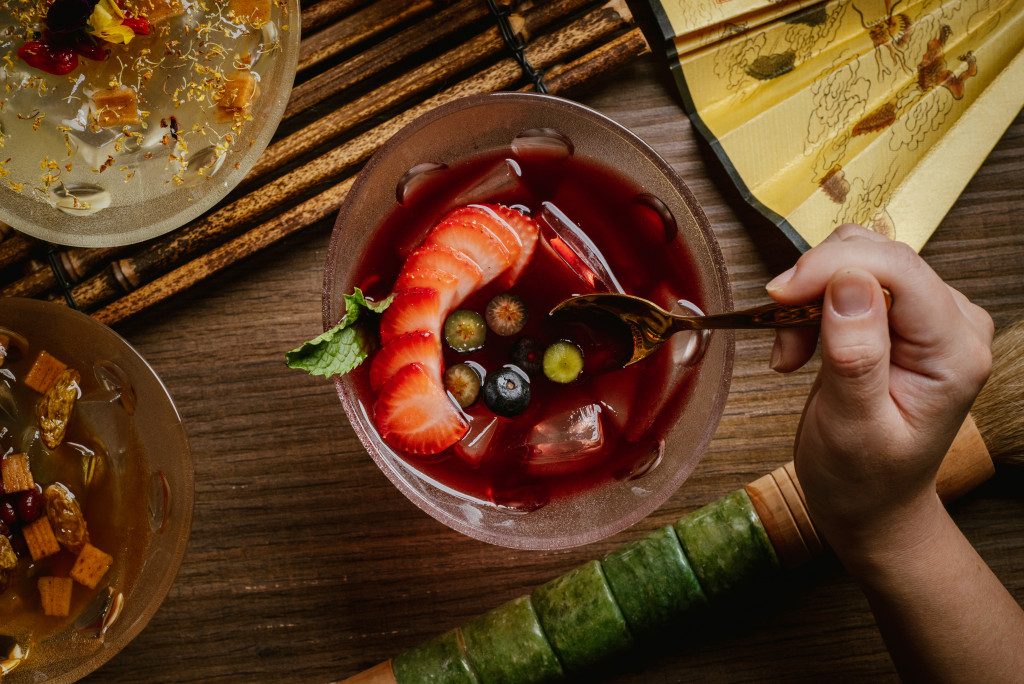 紅卜卜的草莓洛神花冰粉,甜甜酸酸,配有滑嫩的冰粉,入口即撲滅辣火。