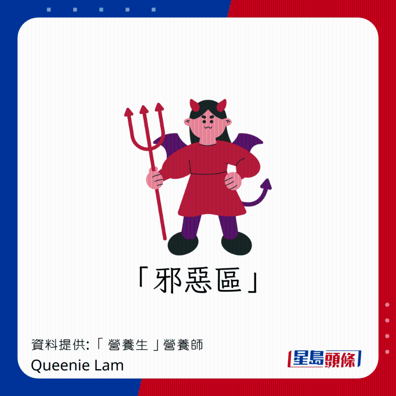 Queenie補充指“天使區”的低脂蛋白質均含有人體必需氨基酸,多攝取有助促進新陳代謝及新細胞形成。而“警號區”及“邪惡區”是加工食物為主,更影響蛋白質于小腸吸收,因此建議減少攝取。最后,她建議可以選較少添加劑、不經油炸及非包餡類別的丸類,可避免因多重加工食品而加重肝臟排毒負擔。