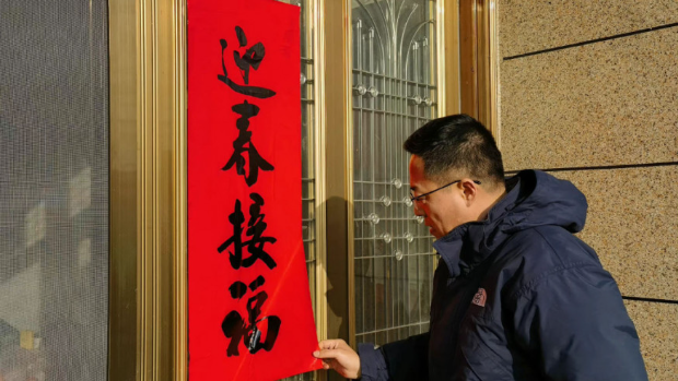 照片中的趙立堅身穿一件藍色大衣,在門口貼上“迎春接福”的春聯。網民關注到貼文發布于江蘇,因趙立堅是河北人,猜測可能是陪湯天如回娘家。