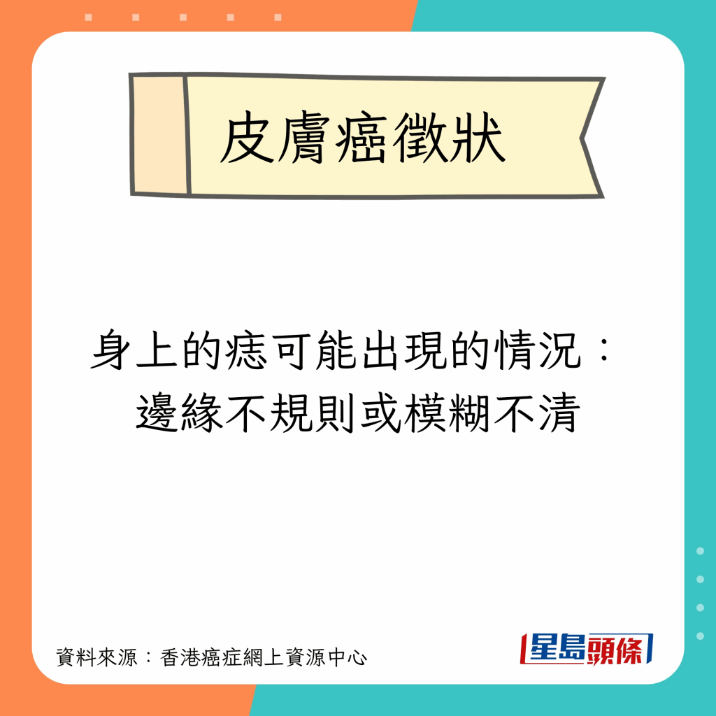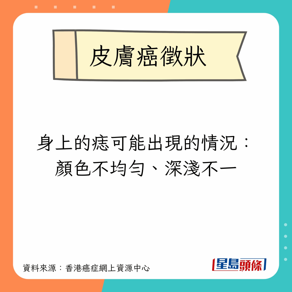 香港癌癥網上資源中心指,不同種類的皮膚癌有不同的征狀,比較常見的征狀包括以下9種: