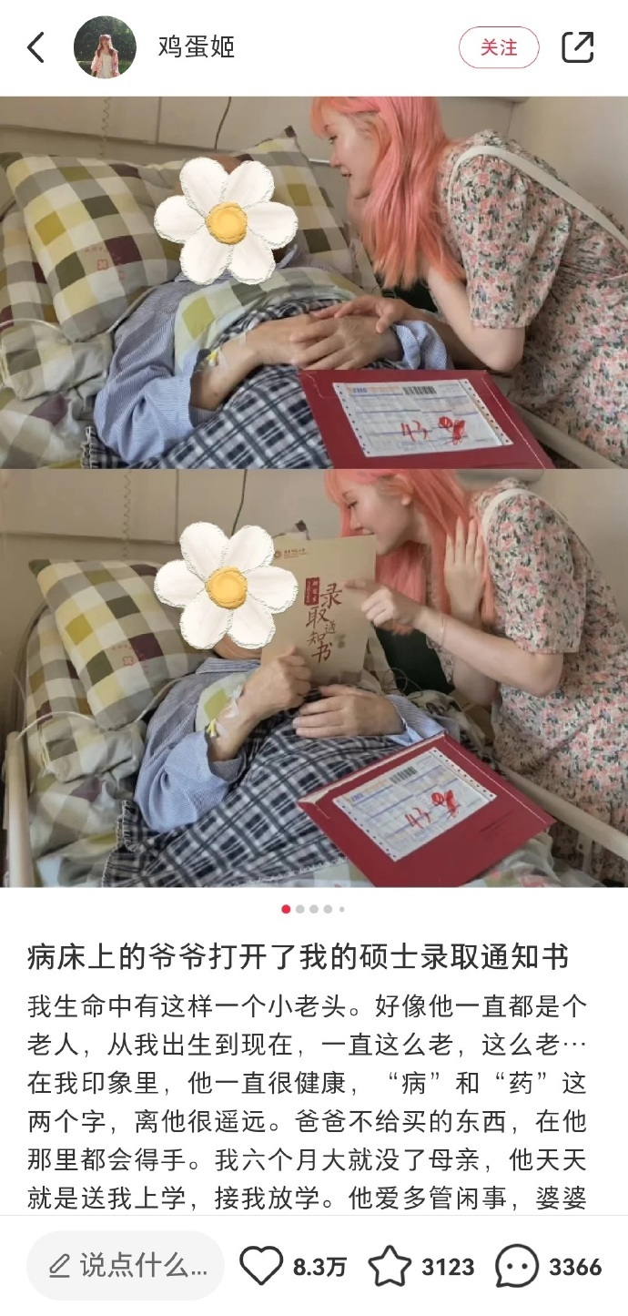 ▲2022年7月,在被保研到華東師范大學后,鄭某華第一時間拿著錄取通知書到醫院,與病床上84歲的爺爺分享這一喜事。