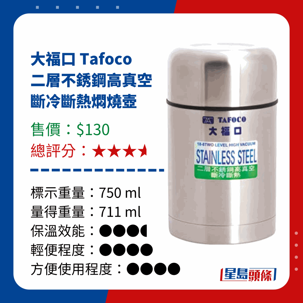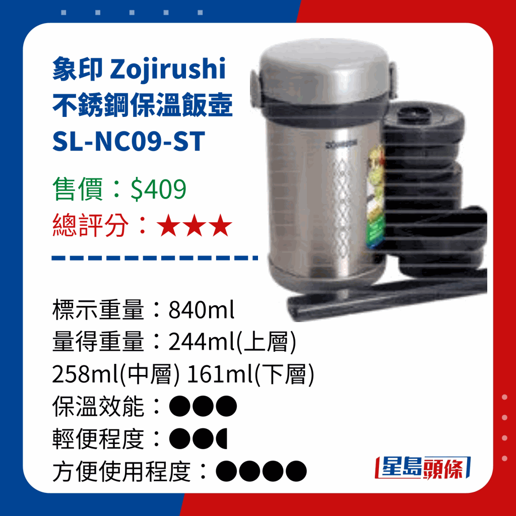8 款燜燒壺價格由 130 元至 449 元,其中 1 款 190 元及最貴 449 元的樣本總評同獲4分;7 款保溫飯壺每套售價由 169 元至 468 元,其中 1 款 181 元及另 1 款 409 元的樣本總評得 3 分,同為表現最佳的保溫飯壺,相比測試中最貴的樣本略勝一籌。