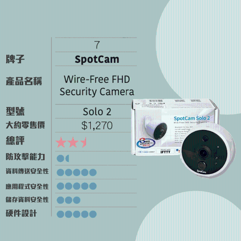 當中有 2 款(EZVIZ、D-Link)的預設密碼只有 6 位數字或字母,強度非常低,較容易讓駭客破解,而竊取影片。另外,當使用“ SpotsCam”的手機應用程式登入帳戶時,駭客可“無限制”地不斷重復嘗試以竊取帳戶資料。