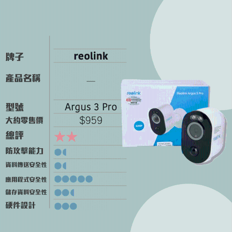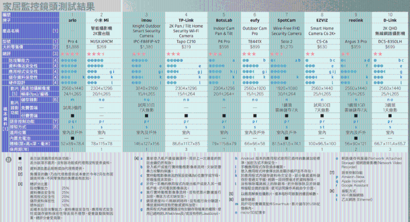 是次測試的10款家居監控鏡頭樣本,包括arlo、小米、imou、TP-Link、BotsLab、eufy、SpotCam、EZVIZ、reolink,以及D-Link, 售價介乎$269至$1,888。全部樣本均提供雙向語音對話、移動偵測、夜視、Amazon Alexa 及 Google Assistant語音控制等功能。當中9款的安全隱患包括沒有以加密方式傳送影像和資料、未能防御駭客以“暴力攻擊”(brute force attack)方式破解密碼等。