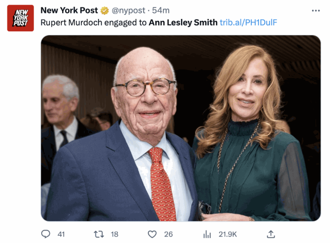 92歲美國傳媒大亨默多克透過旗下媒體宣布第五次結婚,新娘子是66歲的前三藩市警察牧師安·萊斯利·史密斯 (Ann Lesley Smith) 。這名數月前才與第四任妻子辦完離婚手續的傳奇商業鉅子透露,他是在3月17日成功求婚的,希望與新太太一起度過下半生。他說:“我害怕墜入愛河,但我知道這將是我的最后一次。最好是。”