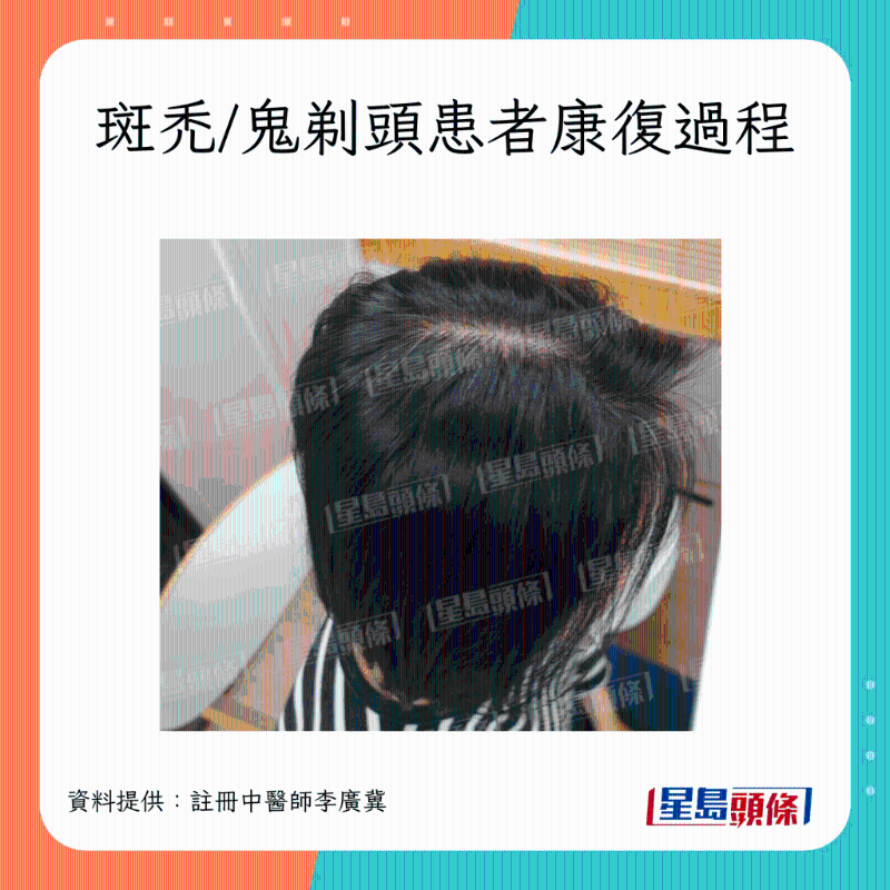 脫發情況持續了1年多,該女子向李醫師求診。 李醫師表示,初診時她約有6個斑禿區,治療2個月后,直徑較細的斑禿位置逐漸好轉,但后枕斑禿范圍持續變大。服用中藥及接受針灸治療8個月后 ,該女子后枕斑禿情況開始好轉,逐漸長出細毛發,速度也十分快。 經過約1年中醫治療后,該女子脫發情況已康復九成。