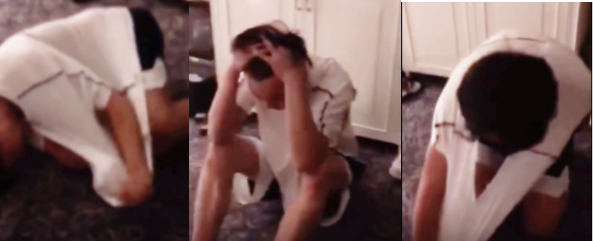 ▲張恒趴在地上拉扯著衣服。視頻截圖
