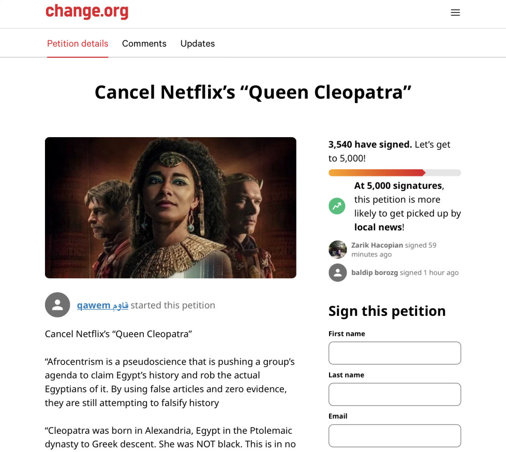 ▲change.org 聯署抗議Netflix《埃及艷后》項目被刪除后,重新收集到數千個簽名。 網頁截圖
