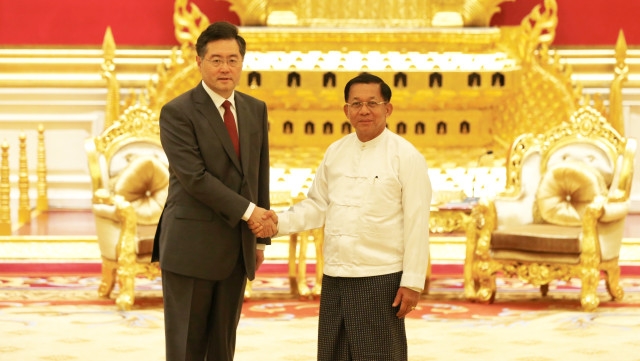 國務委員兼外長秦剛訪問緬甸內比都,與緬甸領導人敏昂萊會面。