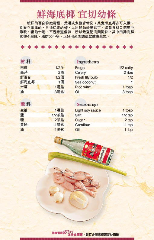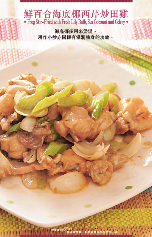 小炒的做法簡單又富香氣,是家常菜之選。今日教大家烹調的“鮮百合海底椰西芹炒蛙”,以肉嫩鮮甜、脂肪低的蛙,配爽口的西芹、鮮百合及海底椰,口味清爽鮮味。喜歡吃有味飯,不妨一試加勒比海燴雞飯,米飯煮至軟糯入味,熱辣辣一大鍋上桌,味道香濃惹味。