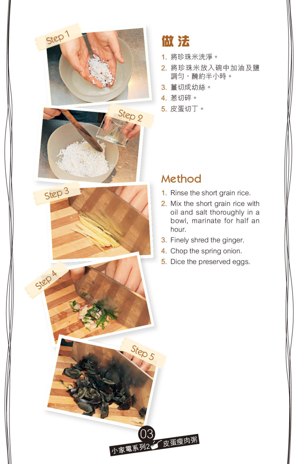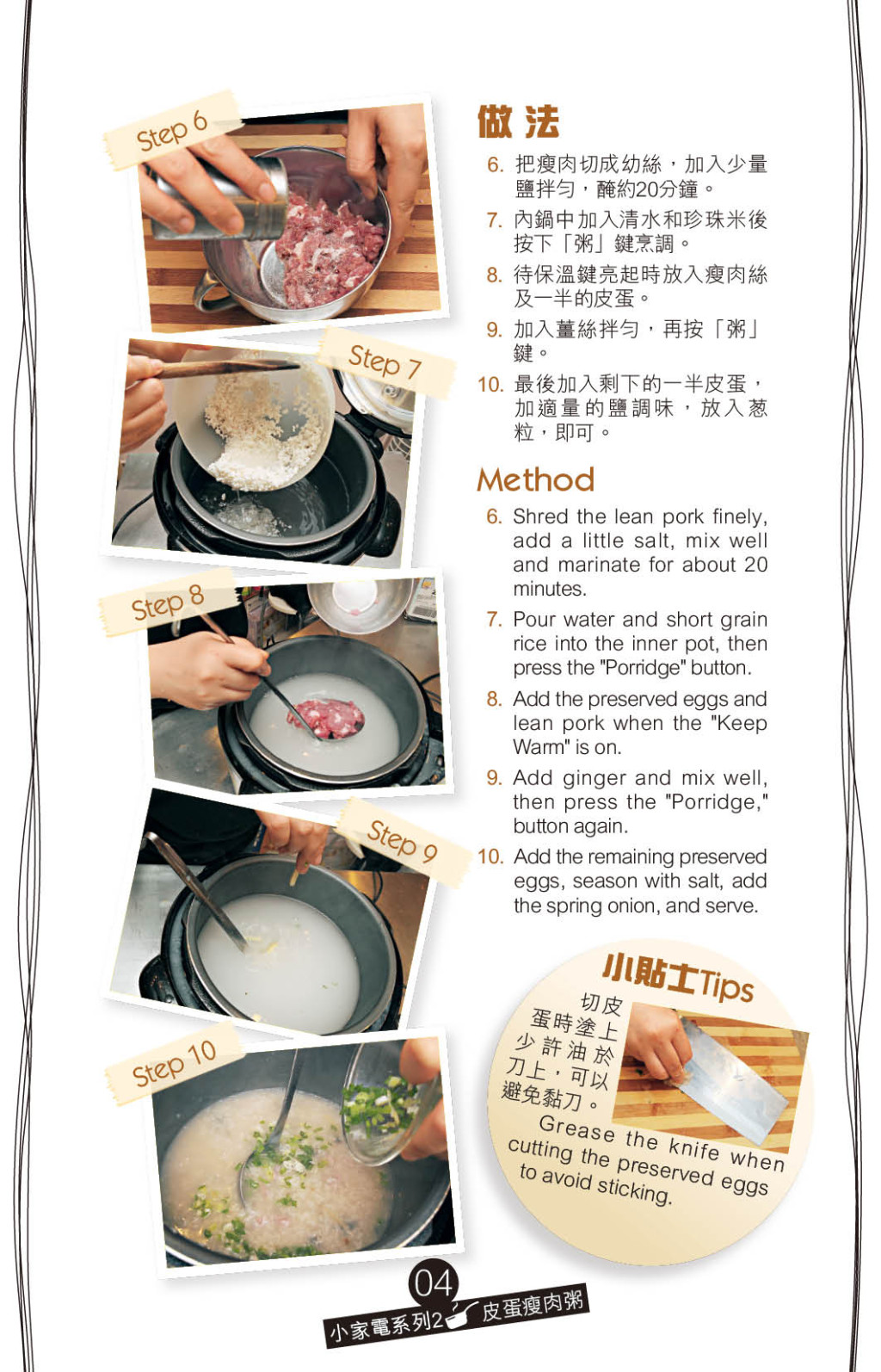 炮制皮蛋瘦肉粥有不同方法,最簡單是用電飯煲煮好粥底,再加入瘦肉和皮蛋。想粥底更綿滑,可預先浸透白米,再加少許油、鹽略醃,才加水煲粥。