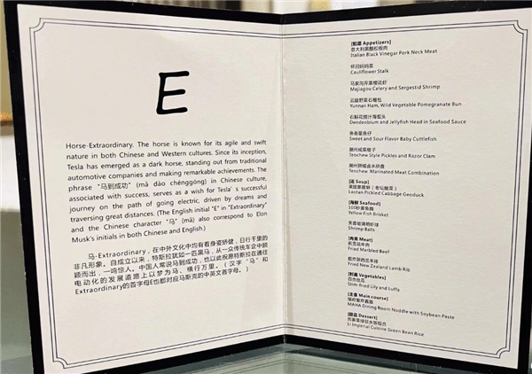 菜單內頁則字母“E”作主圖,十分醒目,繼而用中英雙語介紹了“馬”的含義,以及祝愿特斯拉在通往電動化的發展道路上以夢為馬、橫行萬里。