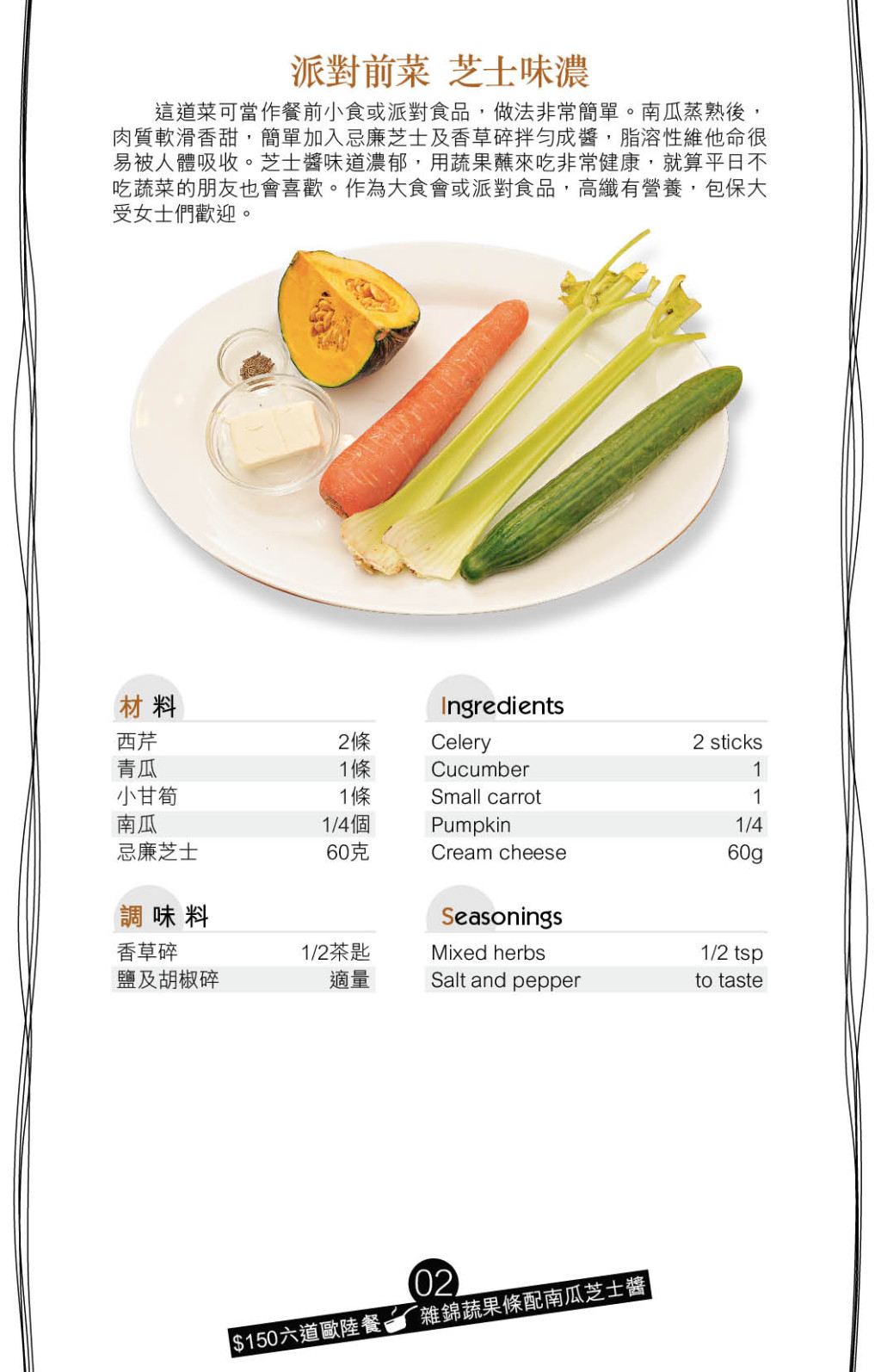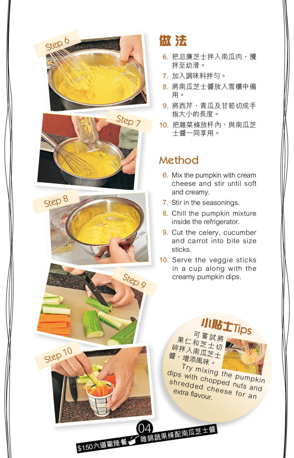 炮制健康小食,可做一個美味沾醬配蔬菜條,好像“雜錦蔬果條配南瓜芝士醬”,便以蒸熟的南瓜壓成蓉,再拌忌廉芝士,味道香甜濃郁,最適合配搭清新蔬菜條。