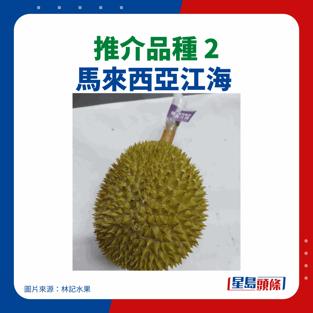 馬來西亞榴蓮江海雖然果肉較小、果肉細,但好處是核細,而且味道佳。入口純甜帶濃厚的奶油香味,肉質“creamy”,完全不帶苦澀,很合港人口味。江海價錢亦不貴,平均市價約 $60左右一磅,比貓山王便宜。