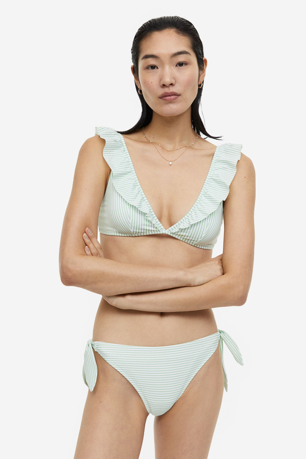 ▲條紋拼荷葉邊比基尼上衣/HK$149及高衩綁結泳褲/HK$99/H&M。