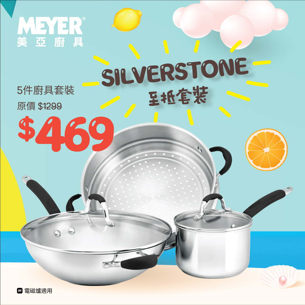 Meyer美亞廚具夏日祭期間,原價$1,299的5件廚具套裝減至$469,足足勁減$830! 留意這個套裝是限量發售,手快有手慢無! 套裝包含不銹鋼單柄鍋、不銹鋼煎鍋、蒸籠,還配以強化玻璃蓋,幾件產品皆適用于所有爐具,所以電磁爐用家都可以放心選購。
