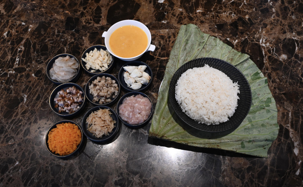 曾師傅解釋,荷葉飯結合了用荷葉提香及包裹食物以便攜帶的民間飲食智慧,隨著時代進步,炮制荷葉飯還講究精挑食材、佐料配搭、調味精準、刀工細致及火候掌控的烹飪技巧。先說白飯,最好嚴選煙韌有嚼勁的絲苗米,煲煮時水分不宜下太多,炒起來才可顆顆分明、軟硬適中。