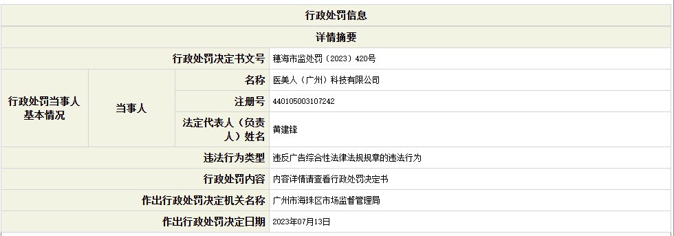 ▲醫美人(廣州)科技有限公司行政處罰資料。圖:廣州市市場監督管理局