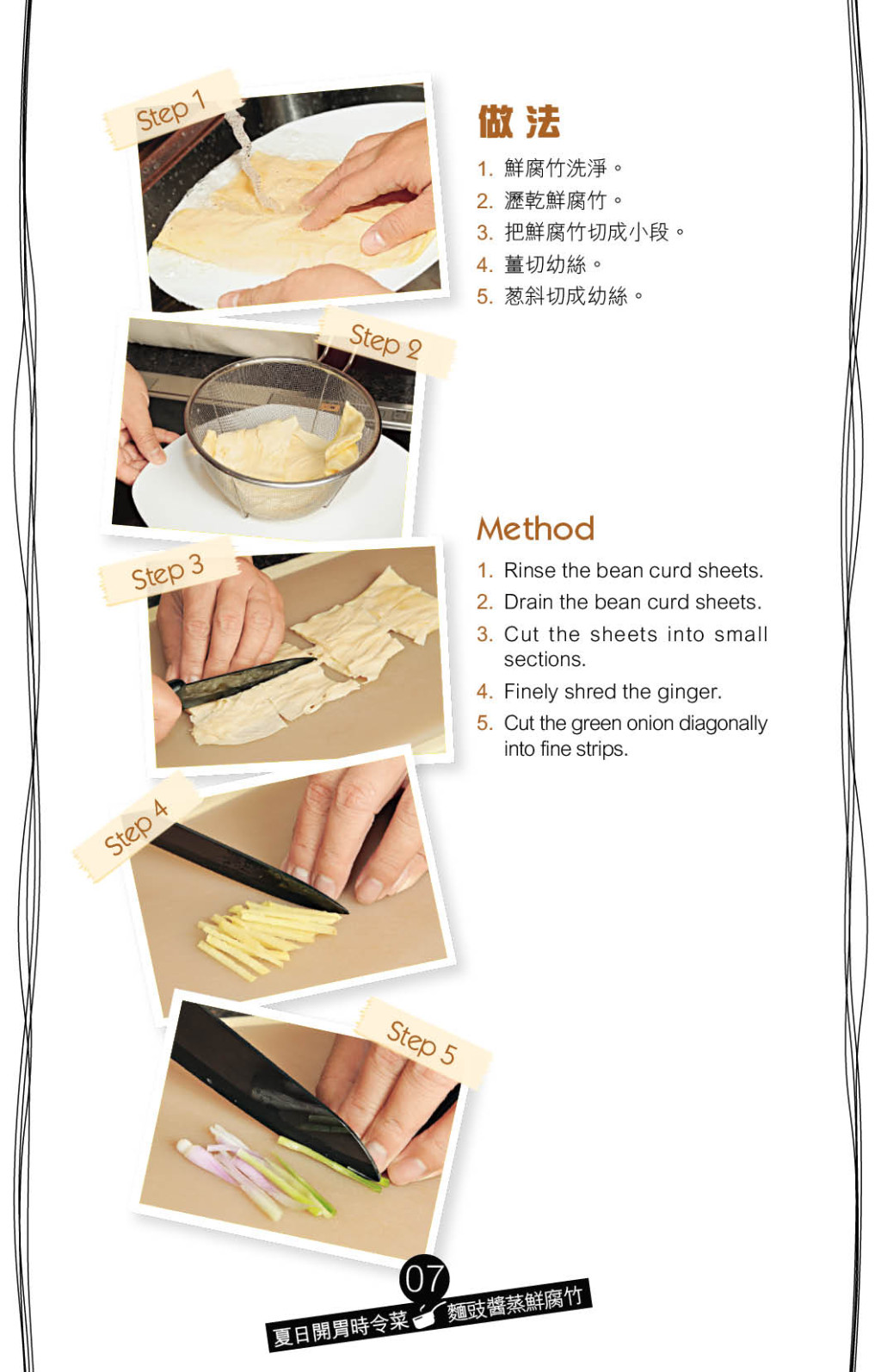 鮮腐竹豆味香濃,口感滑溜清爽,最適合夏天食用。這道“麵豉醬蒸腐竹” 選用在街市有售的鮮腐竹制作,豆味特別濃郁。簡單炮香薑和蒜,加入麵豉醬及調味料煮成醬汁,伴蒸腐竹吃,入口鮮香清爽。