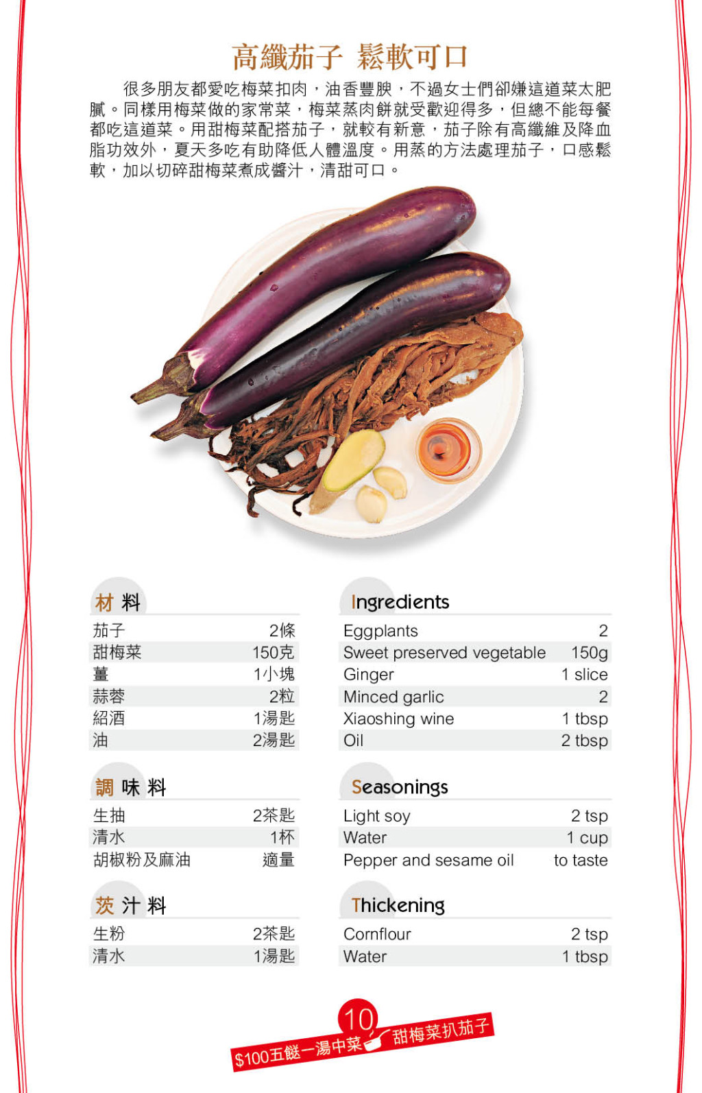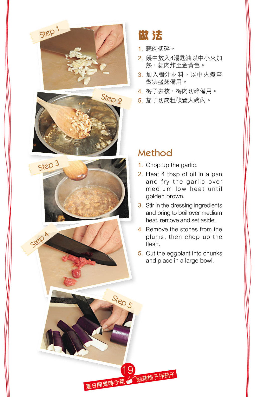 兩款蒸茄子分別以中式及日式方法炮制。中式的“甜梅菜扒茄子 ”,建議選用甜梅菜入饌,烹調前浸泡梅菜片刻,減少咸味,并加入糖、酒、麻油吊味煮成醬汁,淋在清淡蒸茄子上。日式的“勁蒜梅子拌茄子”加入了蒜頭、醃梅子、日本木魚碎及日本冷麵醬汁,味道更鮮美有層次,充滿和風滋味。