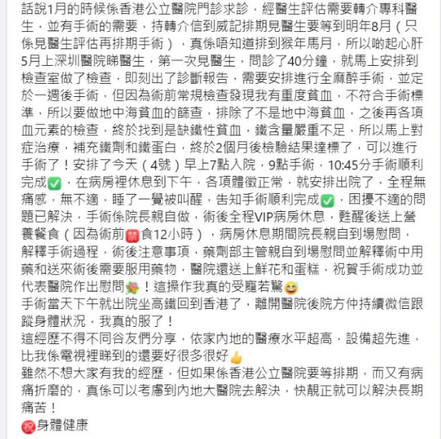 最近,港人chen女士在臉書群組分享了自己到深圳看病的經歷。