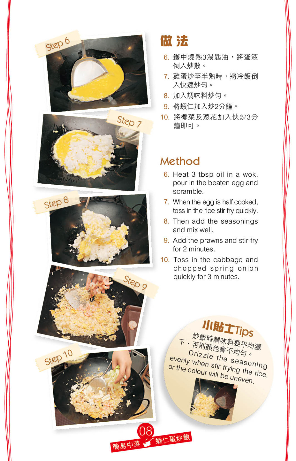 做炒飯的材料配搭多元化,“蝦仁蛋炒飯”是經典口味。這個食譜除了加入鮮蝦及雞蛋外,還加入椰菜絲豐富口感及均勻營養,味道鮮香??呻S意加入不同配料,如牛肉、豬肉或海鮮等,又可加入青豆、粟米、燈籠椒等蔬菜,想增加咸鮮香味,可以加少許蝦醬調味。