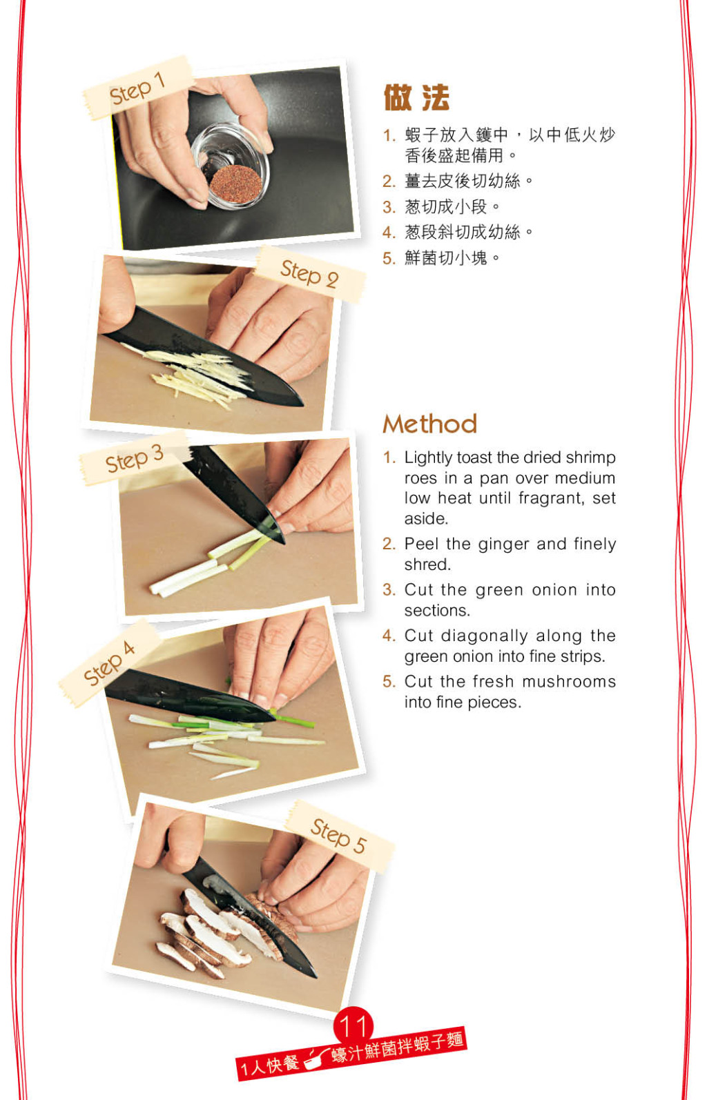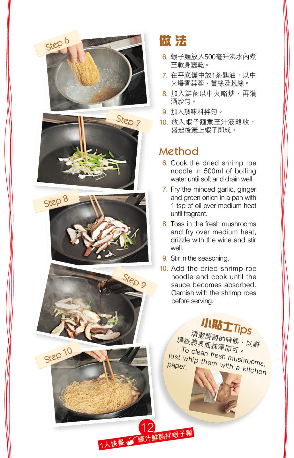 家人喜歡面食,不妨做“蠔汁鮮菌拌蝦子面”作為午或晚餐,簡單以姜、蔥及蒜爆香鮮菇菌,加入灼熟的蝦子面及蠔油等調味料拌勻,再灒紹興酒添香氣,最后撒上蝦子提升鮮味。