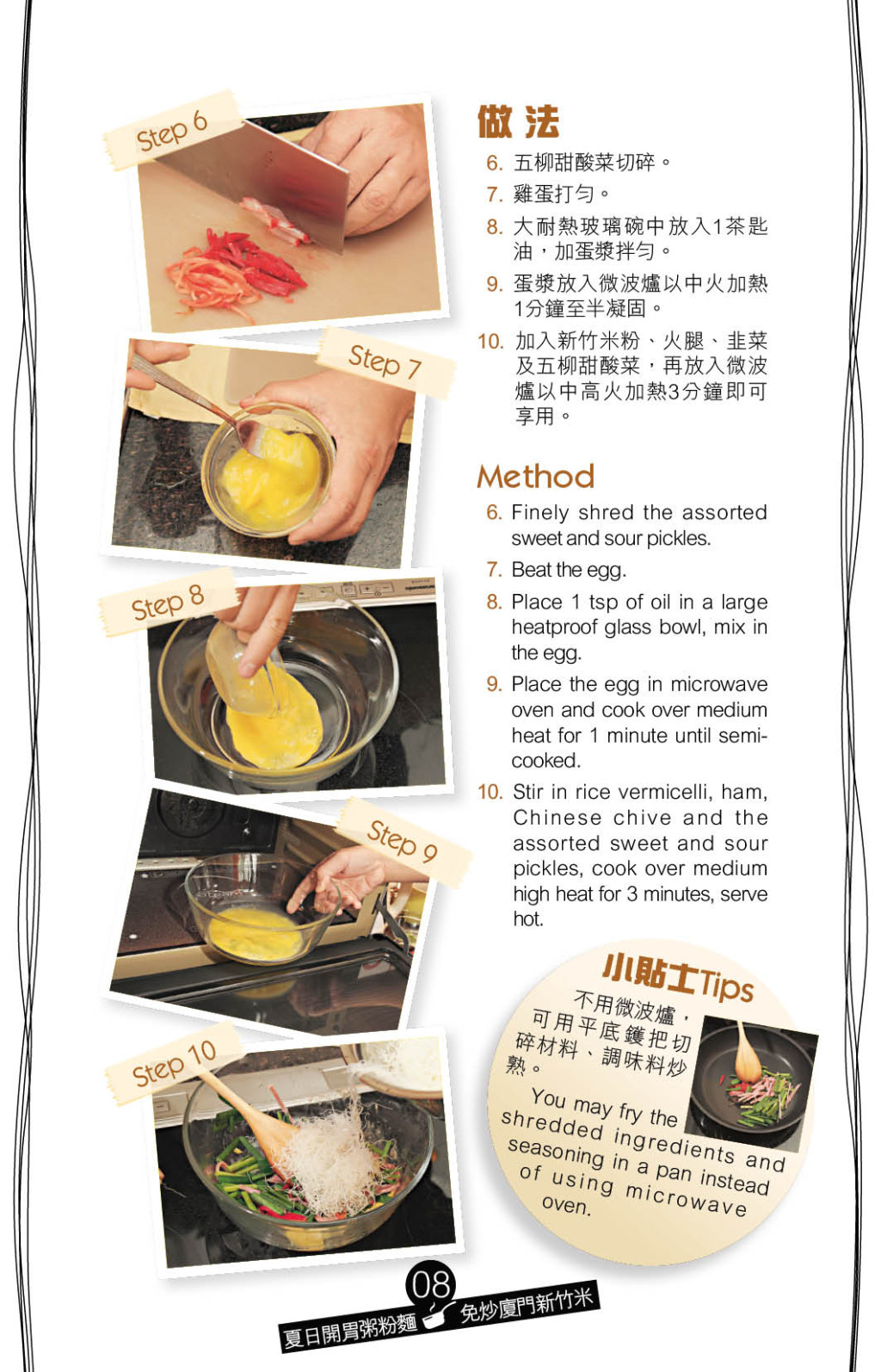 主食當中,米粉的質感最爽口。今日教煮的“免炒廈門新竹米”使用微波爐烹調,特別加入五柳甜酸菜、茄汁、蘋果醋調味,令酸甜味道更有層次,味道醒胃。