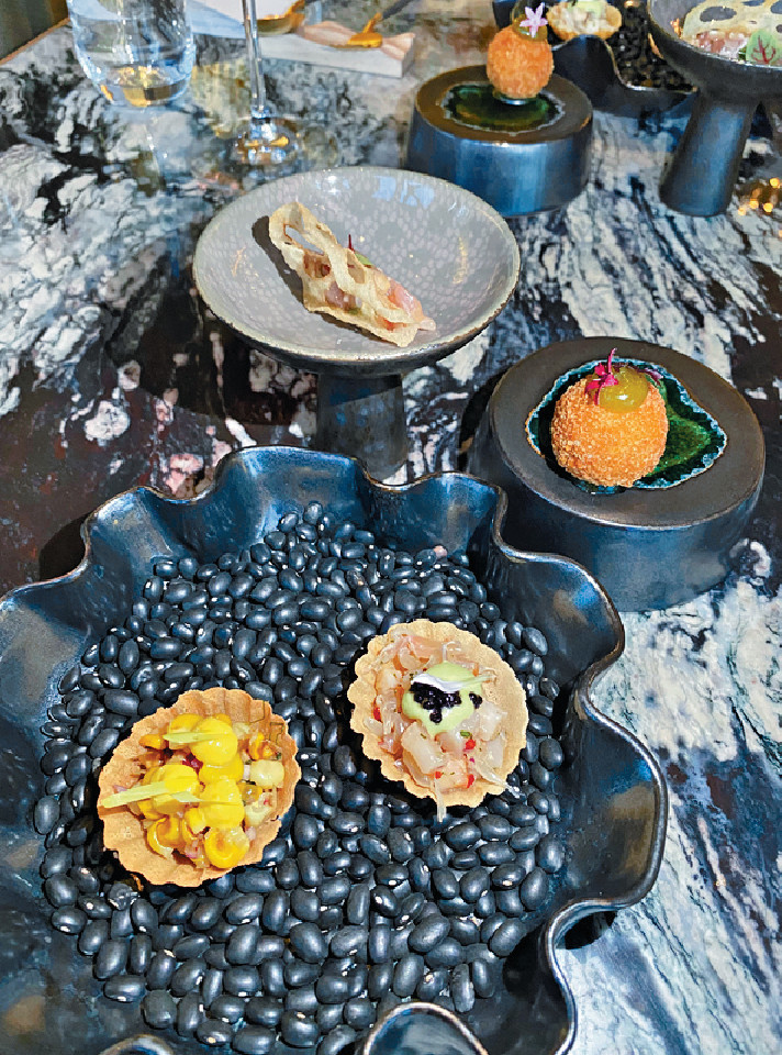 接下來的前菜可從鮮蝦及日本蠔二選一,服務員細心解釋,眼前賣相精美的鮮蝦靈感源自Goong che nam pa泰式生蝦,只是這兒以水煮蝦取代傳統生蝦,再配合散發海洋氣息的海葡萄,以及冰涼酸辣的紅菜頭雪葩; 至于日本蠔沿用泰式花椒、北泰香料,再配合辣油及燒焦蔥泡泡提味,吃罷麻辣余韻良久不散。