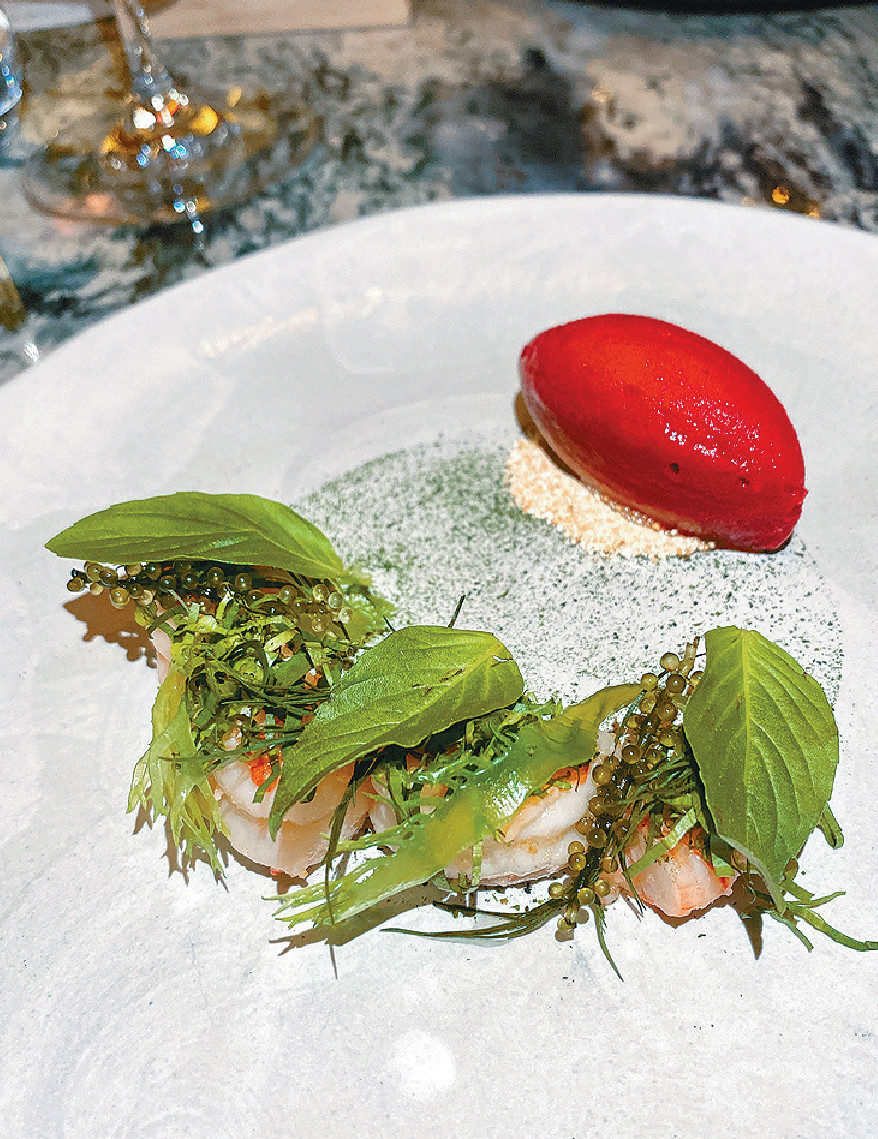 ▲鮮蝦配海葡萄伴紅菜頭雪葩。