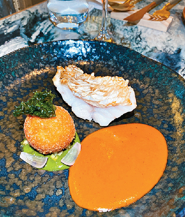 接著的第二道菜,提供Amadai甘鯛或松葉蟹供選擇,甘鯛自身肉質鮮美稠密,配合經油泡炸煮至片片高聳、口感香脆的魚鱗,用時醮上少許Choo Chee Curry紅咖喱添香辣; 隨附的配菜炸免治豬肉蝦球,分別以羽衣甘藍慕絲、羽衣甘藍莖粒、羽衣甘藍葉、羽衣甘藍干襯托,以羽衣甘藍的四重風味,提升炸物的味道口感,同時食材盡用,識食惜食。