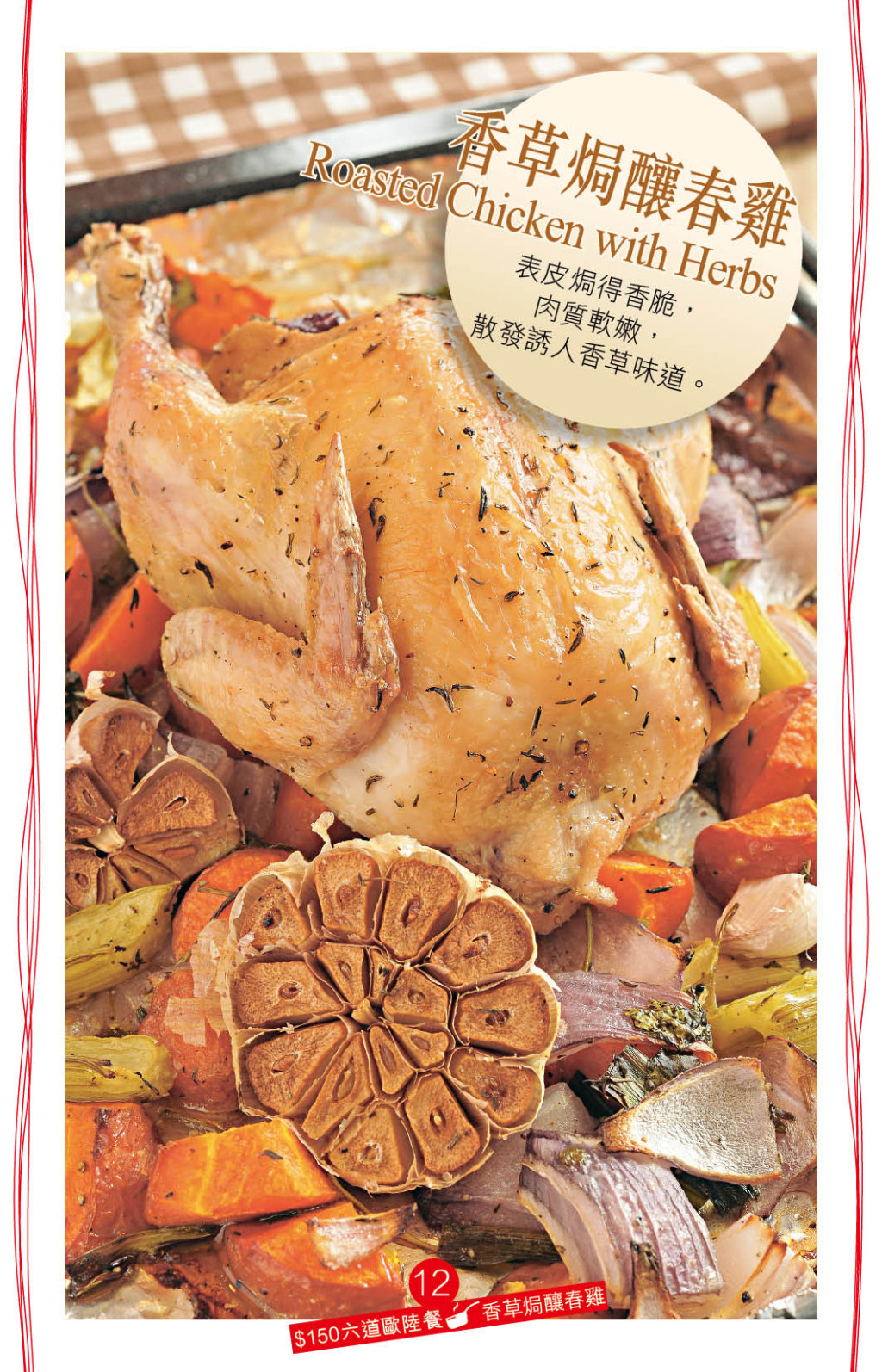 主菜“香草焗釀春雞”的配料豐富,包括原個蒜頭、甘筍、西芹、紅洋蔥、芫荽、青蒜,將所有蔬菜切件,加入香草碎、橄欖油、香草、鹽及胡椒調味后,一半釀入春雞內,另一半放在焗盤,再放上春雞焗至金黃熟透,蔬菜吸收春雞的精華,味道更鮮美。
