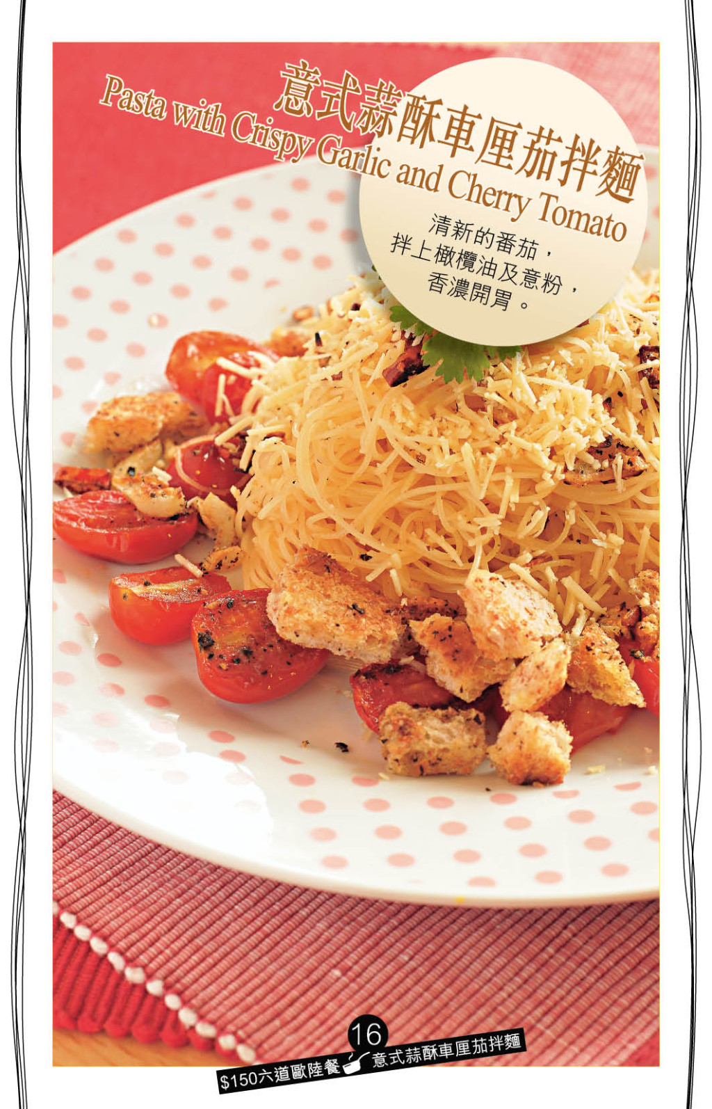 西餐意粉的配搭和烹法千變萬化,今日炮制的“意式蒜酥車厘茄拌面”,重點是用作提味的自制蒜酥,以橄欖油炒香蒜片、紅辣椒碎、烘脆麥包碎、香草碎及調味料,再用廚紙吸去多余油份即可。 意粉拌入巴士臣芝士、車厘茄、紅辣椒干及蒜酥,惹味可口。