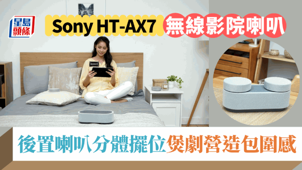 Sony近年積極開發玩法創新的影院系統,如4喇叭列陣的HT-A9,即將于10月登場的HT-AX7,則可視為針對個人的私家無線影院喇叭,獨特分體式設計可1分為3,前置主機坐前,一對后置左、右放到后方,配合360 Spatial Sound Mapping技術,睇戲煲劇可營造虛擬環繞聲,由于喇叭做得輕巧加上無線,客廳、露臺、睡房隨你擺放,就是床上煲劇也可以輕松感受氛圍感。