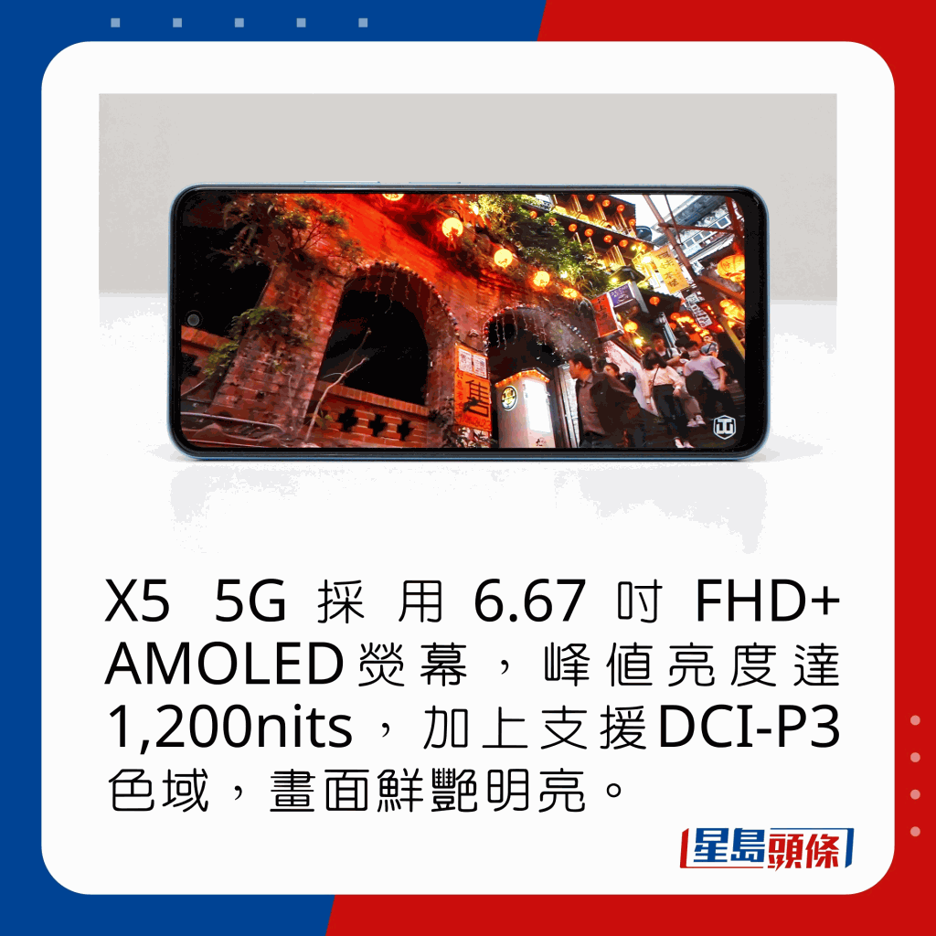 小米旗下POCO向來以高性價比作招徠,這款Android入門5G手機X5 5G也不例外,售價不用HK$2,000,不但用上支援120Hz更新率的6.67吋FHD AMOLED熒幕(解像度2,400×1,080),且擁有1,200nits峰值亮度,處理器也是性能較佳的S695 5G,加上內置最高8GB RAM,效能也是5款推介中最好。影拍方面,X5 5G裝有48MP廣角主鏡、8MP超廣角及2MP微距,前置鏡頭為13MP,成像質素及格。值得一提的是,X5 5G機身除了找到3.5mm耳機插口,還保留紅外線埠,可充當萬能遙控。