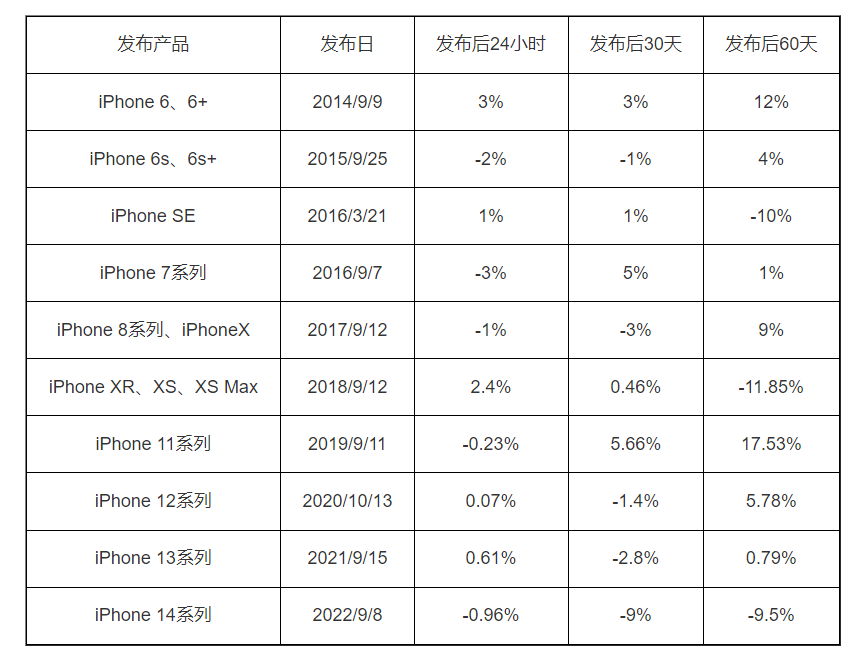 不過亦有例外,去年9月7日蘋果發布iPhone 14系列,當時蘋果股價在大半個月前,已從高位173.5美元下跌至發布日的155美元,累跌一成。其股價在發布日后3個月更持續下挫,跌至今年1月3日的124.5美元。