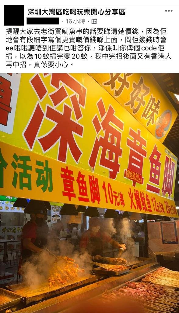 該位網民近日facebook群組“深圳大灣區吃喝玩樂開心分享區”發帖,并附上在東門町“幫襯”的小吃檔相片。帖文開首寫道:“提醒大家去老街買魷魚串的話要睇清楚價錢 ”,接著樓主便便道出原因:“因為佢地會有段細字寫個更貴的價錢喺上面,問佢幾錢時會ee哦哦聽唔到佢講乜咁答你,淨係叫你俾個code佢掃”,樓主以為“魷魚串”是人民幣10元,誰知“以為10蚊掃完變20蚊”。樓主在帖文中更表示還有其他香港人“中招”,“我中完招后面又有香港人再中招”,最后奉勸一眾網民“真係要小心”。