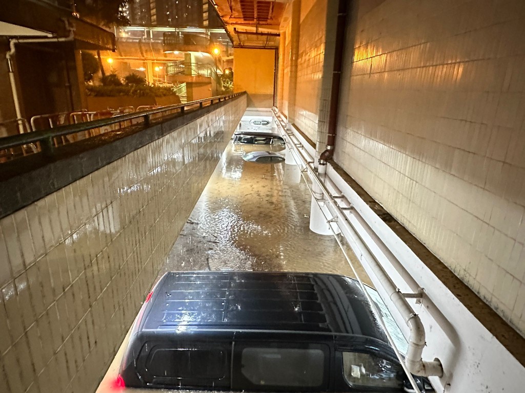 香港由昨晚起落暴雨,天文臺總部昨晚11時至午夜12時錄得一小時錄得158.1毫米雨量,是139年有記錄以來最高,黑色暴雨下全港多處出現嚴重水浸。港島東是其中一個重災區,多條馬路亦淪為澤國,環翠道某段路面有一大塊瀝青石屎更被雨水沖了出來。民建聯社區干事植潔鈴昨日凌晨貼出照片指,環翠商場停車場的積水約浸過半部七人車,但到了凌晨3時左右,同一位置,同一架七人車幾乎已被完全淹沒,僅露出車頂,而旁邊兩架體積較小的私家車,更疑似完全被淹沒在水中。