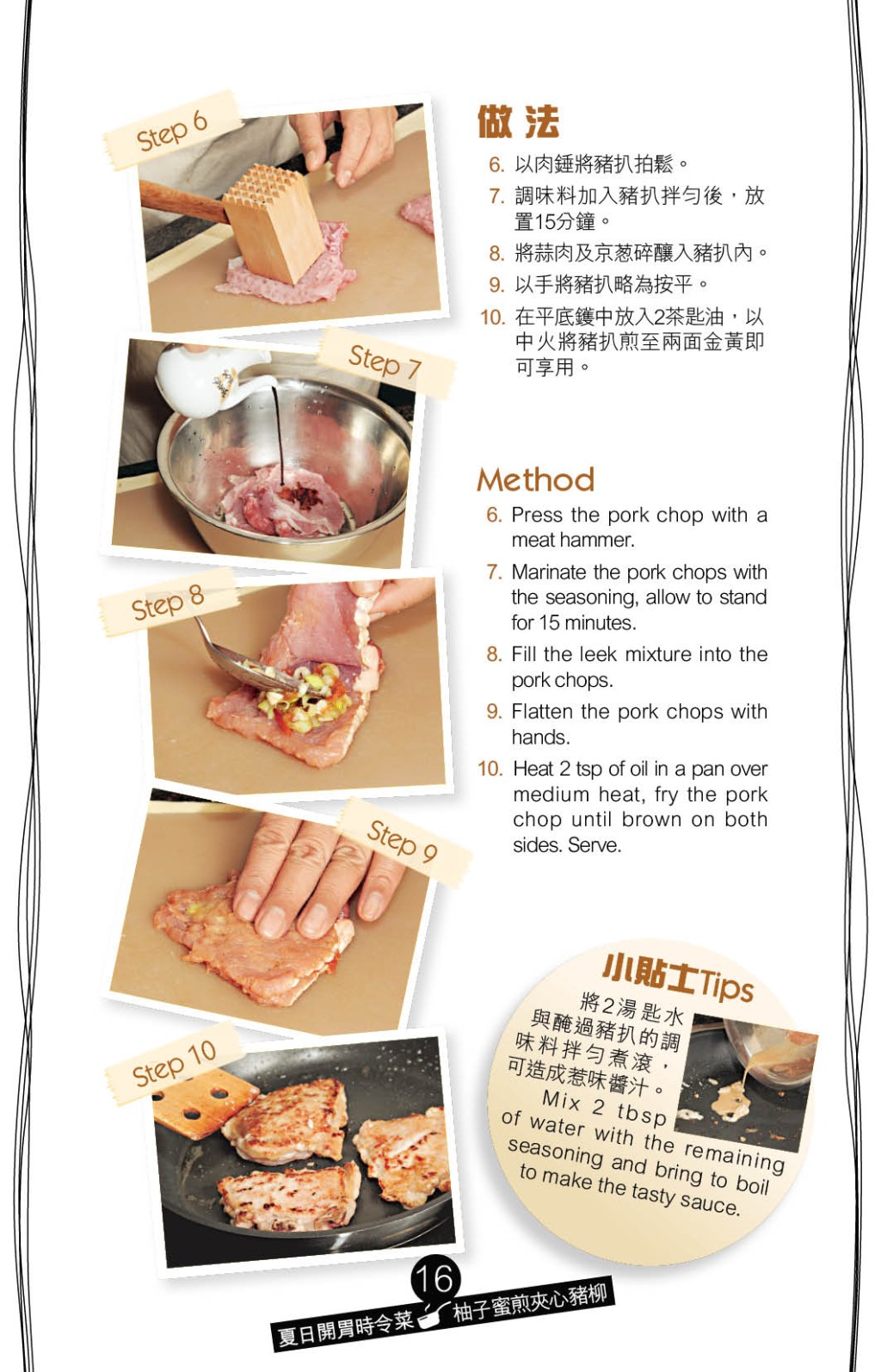 先將豬柳打橫切開造成袋狀,用松肉槌將豬扒捶松,加調味料腌15分鐘,再釀入以京蔥碎、蒜肉及柚子蜜拌勻的醬料。