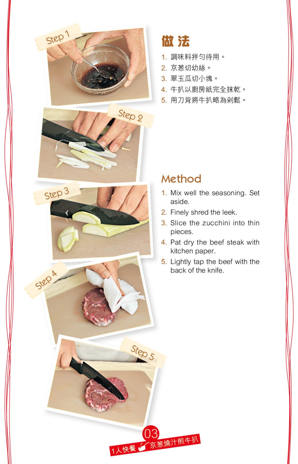 采用中式調味的“京蔥燒汁煎牛扒”,調味汁料以常用的生抽、老抽、紹興酒、糖、胡椒粉、麻油、清雞湯調成。