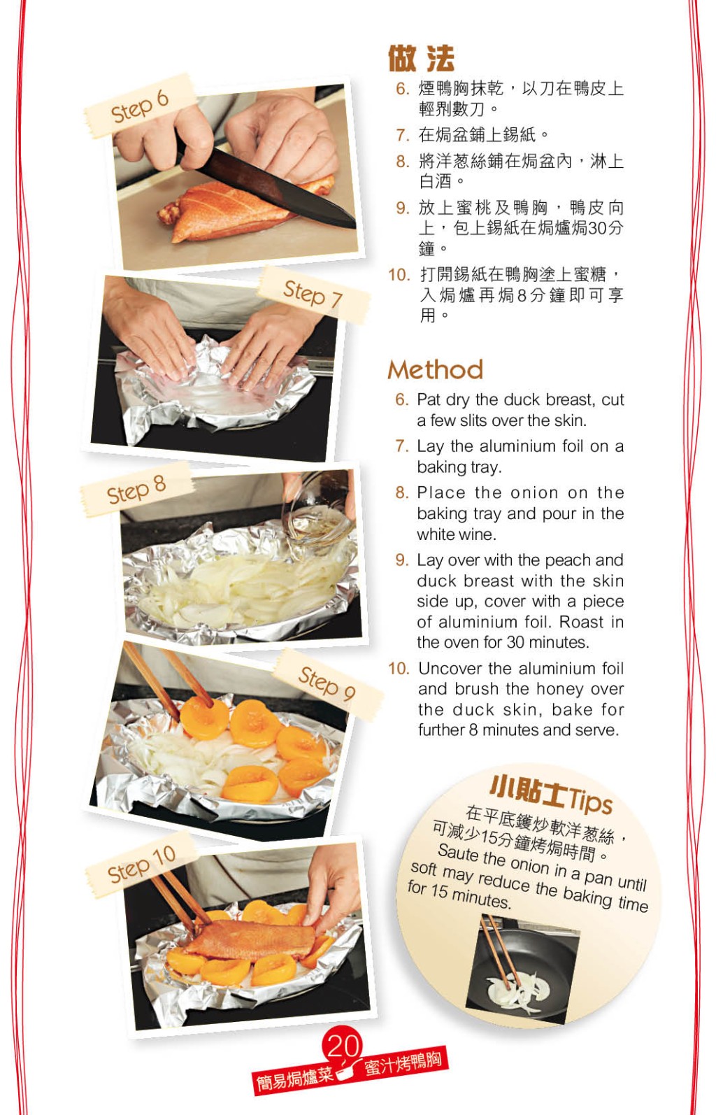 烹調家常菜當然以快捷易煮取勝,其實只要稍加心思,現成的煙鴨胸可變化出不同的美味家常菜。好像“蜜汁烤鴨胸”便是具新意的易煮家常菜。先在煙鴨胸的皮切數刀。將以橄欖油、鹽及胡椒碎拌勻的洋蔥絲放在焗盤,再注入白酒,接著以開邊罐頭桃圍著洋蔥,中間放上鴨胸(鴨皮向上),放入焗爐焗30分鐘,掃上蜜糖再焗香便可。