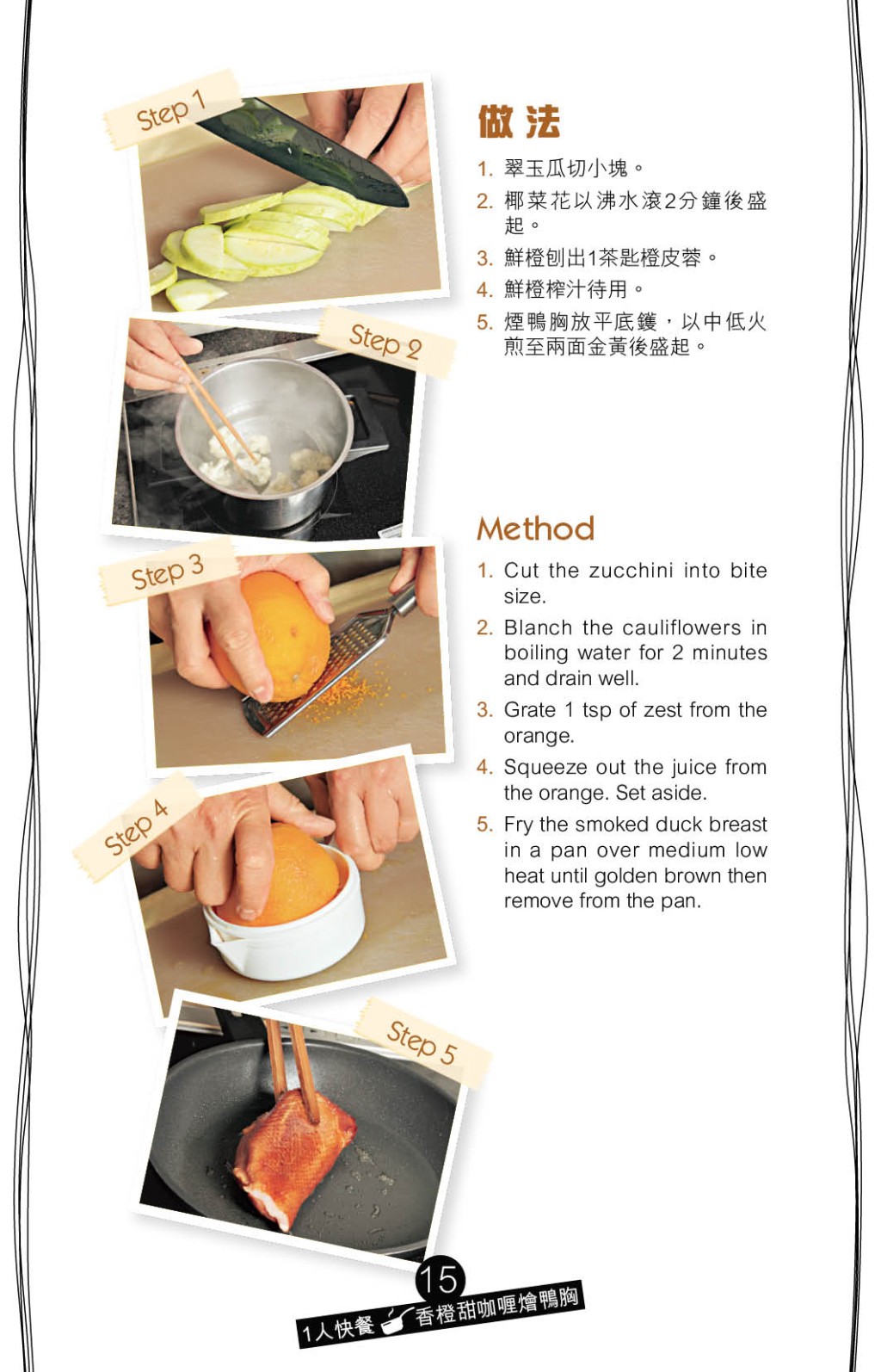這道家?!跋愠忍鹂о瑺Z鴨胸”,以味道豐富的配菜,配搭香煎鴨胸。起油鑊炒香翠玉瓜塊及椰菜花,以清雞湯、橙汁、橙皮蓉及咖喱磚煮至蔬菜軟腍,不妨多留一點醬汁,用來伴飯特別美味。