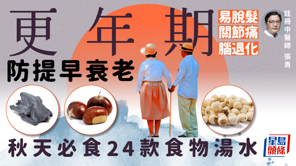 更年期飲食|女性更年期是指在停經前后,卵巢功能自旺盛狀態逐漸衰退及消失,荷爾蒙分泌量下降,引致某些生理和心理轉變的一段時期。至于男性,因男性荷爾蒙水平下降,亦有機會步入更年期,并出現一些跟女性更年期相似的癥狀。注冊中醫師張勇教如何在秋天著手調理,預防提早衰老、紓緩更年期不適的養生方法。