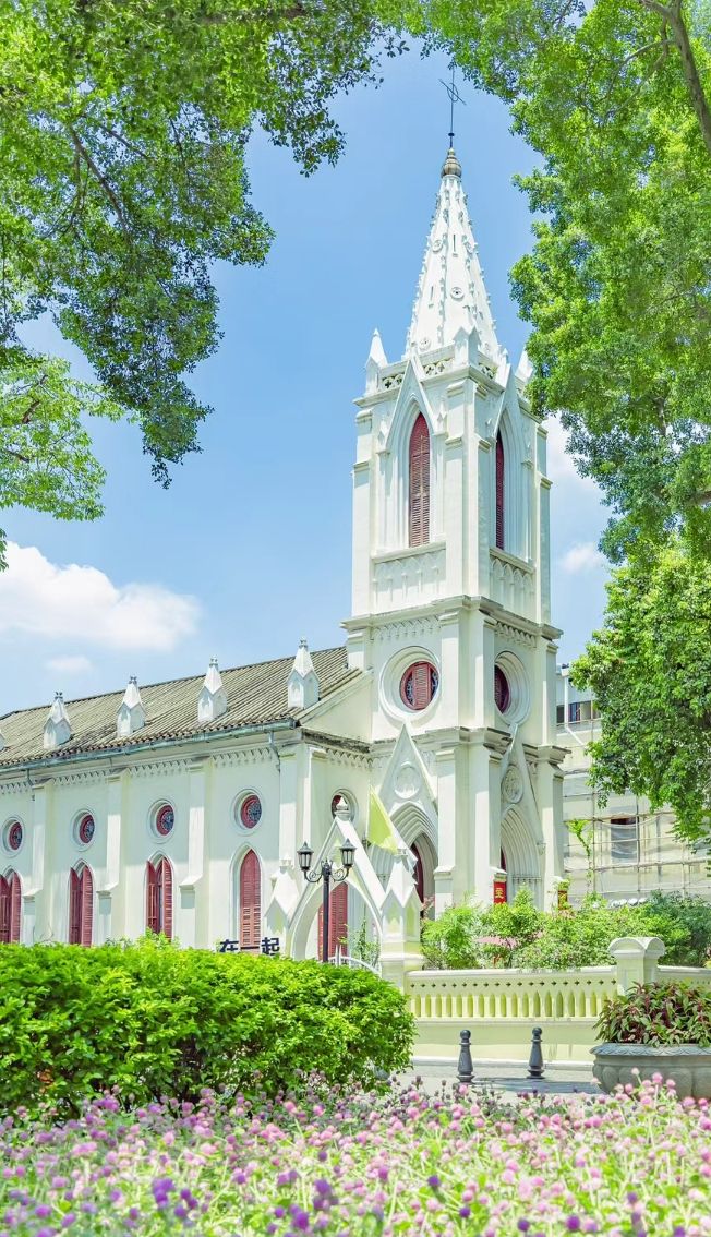 廣州石室圣心大教堂是廣州異域風情的經典,拍照宜選上午開門前或下午開門前,一般較少人。教堂在1861年耗資40萬法郎建立,由法國設計師設計,中國工匠建造,以宏偉的雙尖塔哥特式建筑聞名,也是全球四座全石結構哥特式教堂建筑之一。教堂正面有一對巍峨高聳的雙尖石塔,石塔中間有四具從法國運來的大銅鐘,教堂內的拱形穹頂、彩色玻璃窗、合掌式花窗櫺,都是熱門打卡位。