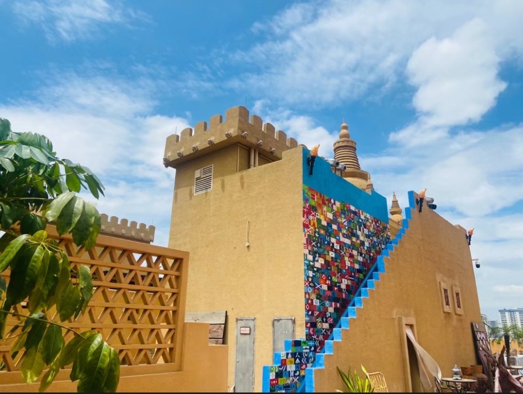 廣州大漠幻城是一間位于大廈天臺的主題餐廳,結合絲綢之路文化,打造成異域風情的實景,迅即成為人氣打卡景點。餐廳實景據說花費RMB2000多萬打造,分戶外和戶內,滿城黃沙、古烽火臺、枯樹、小沙丘、駱駝、仙人掌、西域特色建筑、長廊,營造大漠孤煙氛圍,到處都有西域的影子。游客可以圍爐煮茶,吃小吃、甜點和露營烤肉、飲酒作樂。餐廳的服裝間提供色彩繽紛的民族服裝,讓游客到處取景,拍攝夢幻的異域風情照片。
