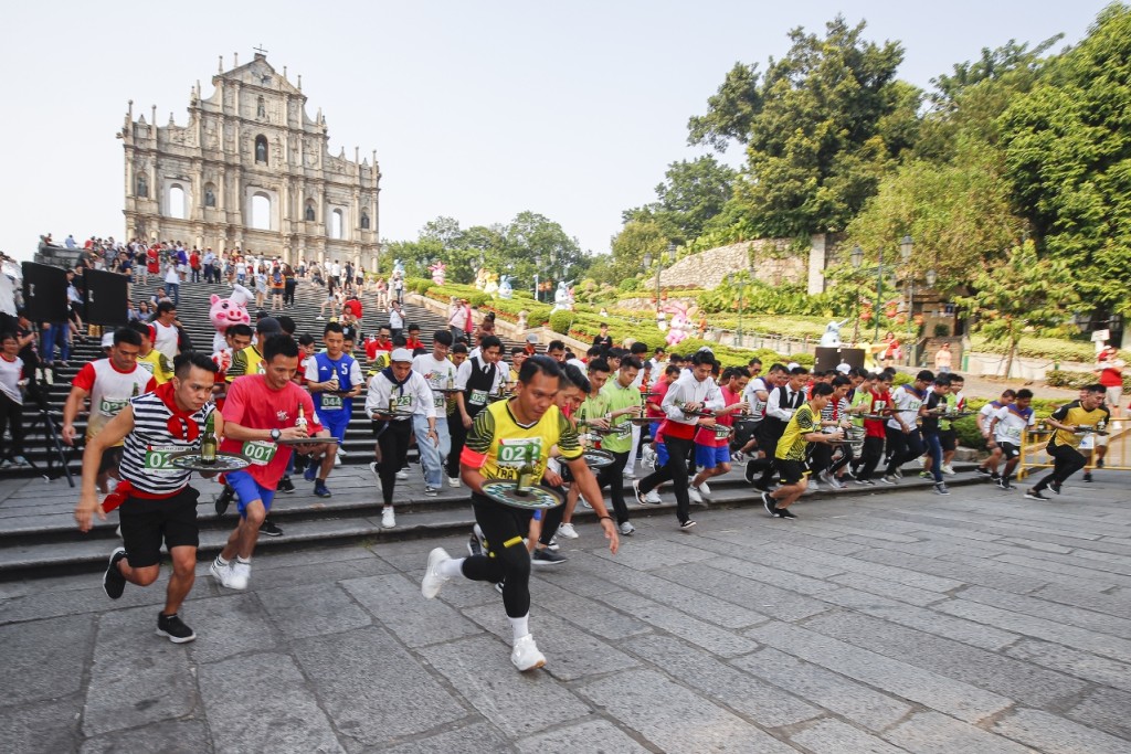 ▲參賽者精心打扮,高速運送“澳門啤酒”托盤。