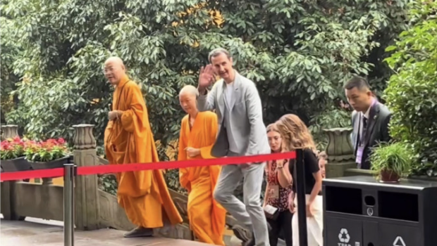 據稱靈隱寺提前鋪了紅地毯,十多名和尚一起迎接,從巴沙爾夫婦抵達門口開始帶路,目測隨行人員不含保安人員也有約二、三十人。