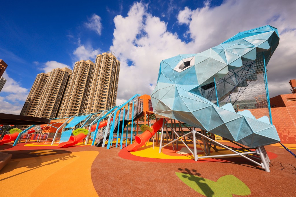 恐龍對小朋友有著懾人魔力,將游戲設施融入恐龍造型,更讓小朋友難以抗拒!焦點為鎮守公園入口,總長26米、高7米的巨型恐龍造型游樂設備 — “暴龍大冒險”,集繩網、攀爬及滑梯于一身,孩子可挑戰4.5米高的網橋,還有3條不同長度及形狀的滑梯、繩網陣、吊床及平衡木等,每組設施均為針對兒童的體能、協調、平衡及觸感多方面發展而設計。