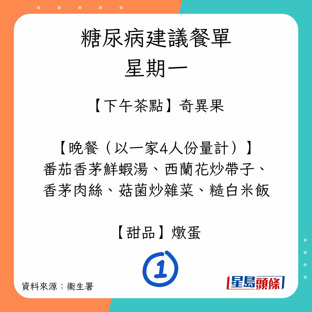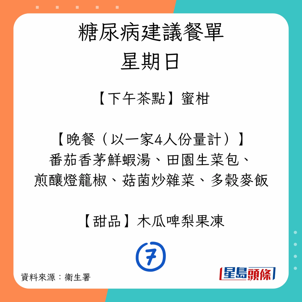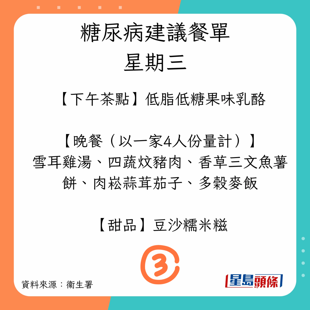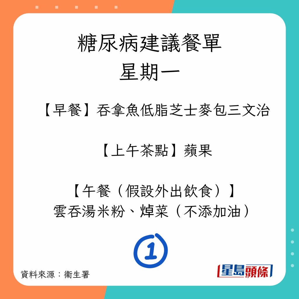患糖尿病后要戒口嗎? 吃甚么可避免病情惡化? 本港衛生署建議,糖尿病患者可以參考以下餐單,準備7日的食物份量: