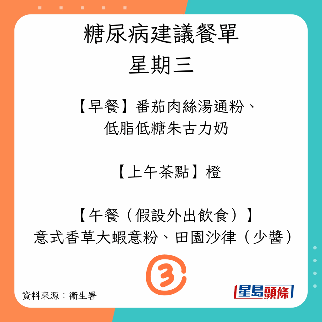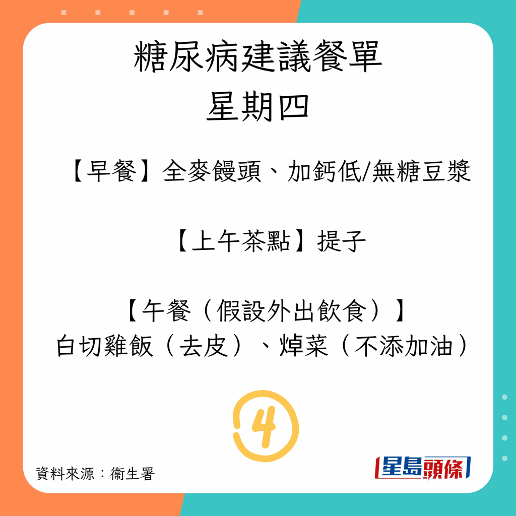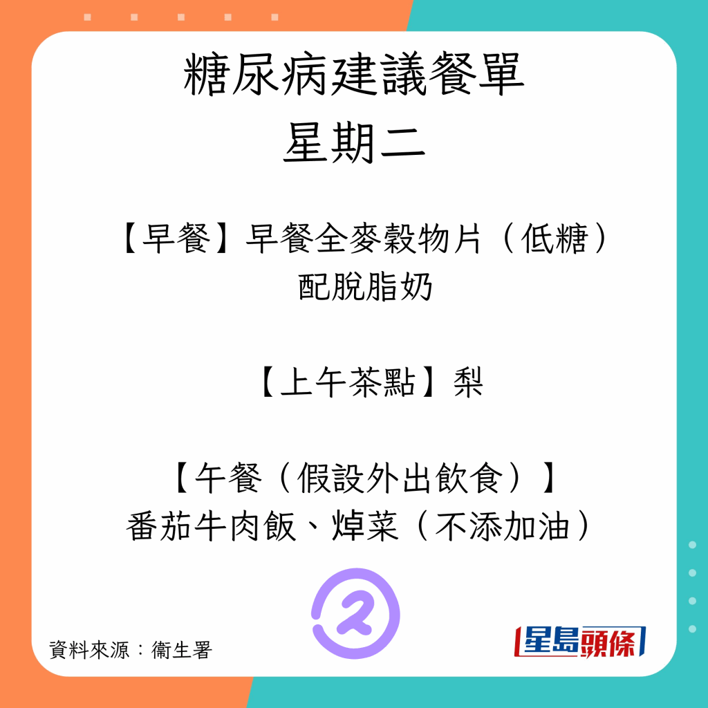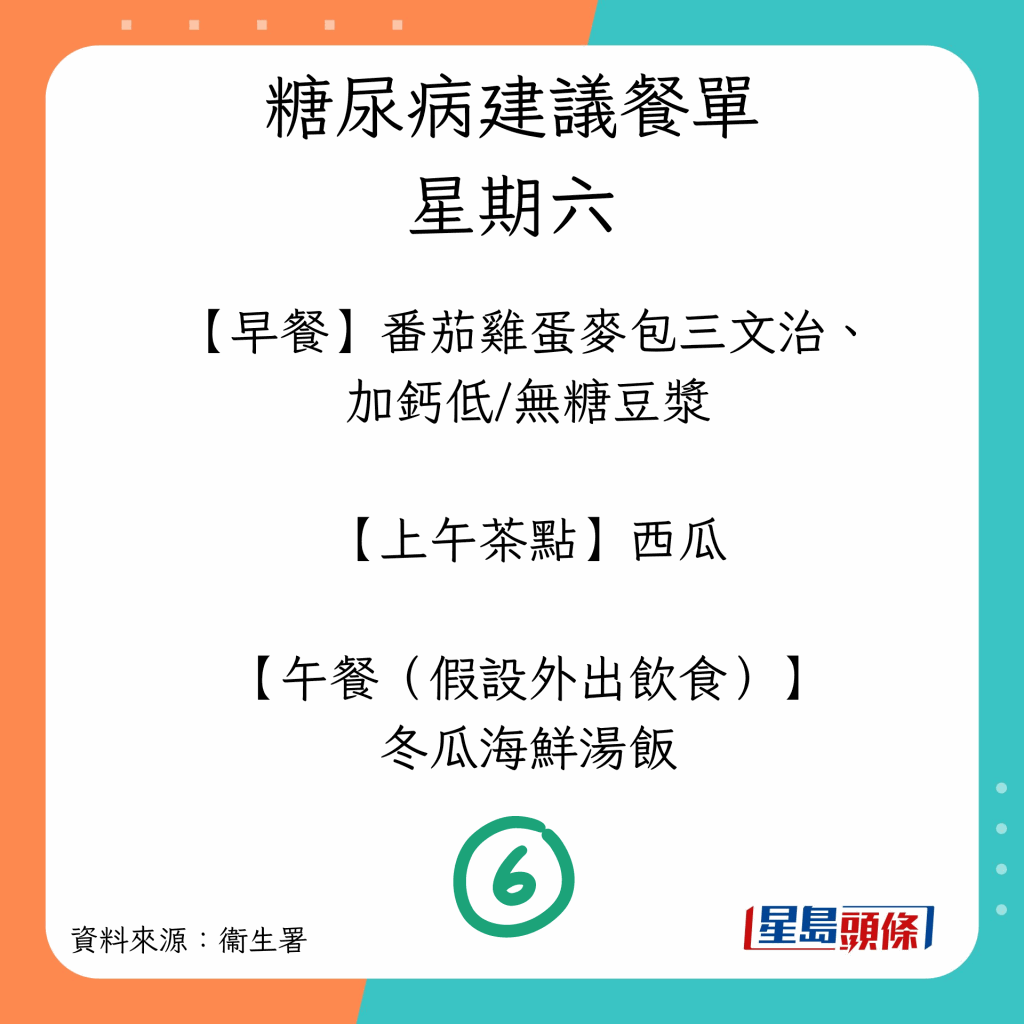 患糖尿病后要戒口嗎? 吃甚么可避免病情惡化? 本港衛生署建議,糖尿病患者可以參考以下餐單,準備7日的食物份量: